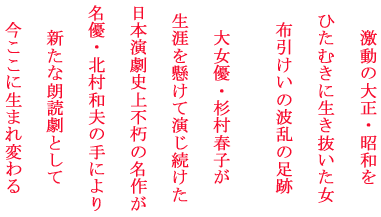 《 スタッフ 》 演出◆北村和夫・吉兼 保 監修◆戌井市郎 潤色◆真船道朗 照明◆小林英典 音響◆秦 大介 演出助手◆青柳令子 舞台監督◆菊地 廣 舞台監督助手◆川野誠一/戸張智春 制作協力◆川井麻貴
