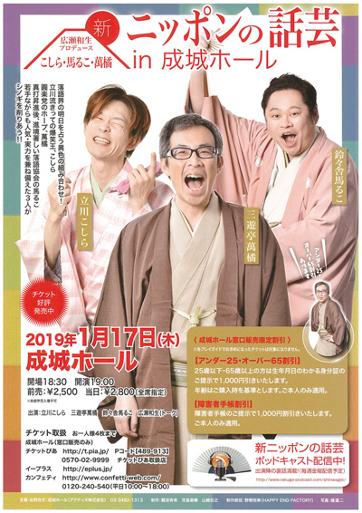 「掟破りの異端児」立川こしら、「何でもアリの自由な芸風」鈴々舎馬るこ、「熱血のストロングスタイル」三遊亭萬橘と、この三人は、個性はまったく異なるが、いずれも落語を窮屈な様式美の世界に閉じ込めることなく「現代に生きる大衆芸能」にしている。 2012年には立川こしらが、2013年には三遊亭萬橘が真打ちに昇進。 2017年春には鈴々舎馬るこが真打ち昇進!