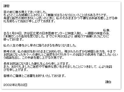 その彼が20年近くの歳月を経て、「私の人生の幕を少し早めに降ろさざるを得なくなりました」との便りを、くれた。
