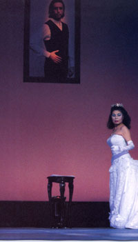 正面に亡き国王の大きな写真。食卓の支度が整うと、王妃はトニーをも退け、喪われた時を超えて、ただ一人、生ける人に対するように写真に向かい、話し掛けながら、盃をあげる。
